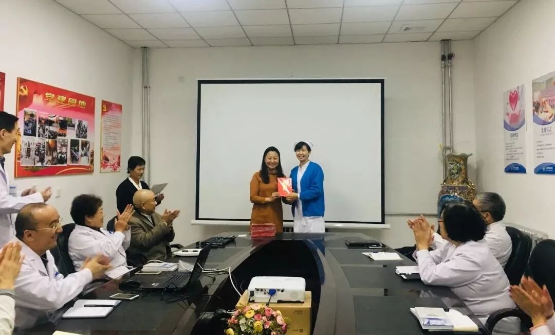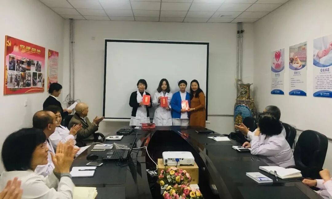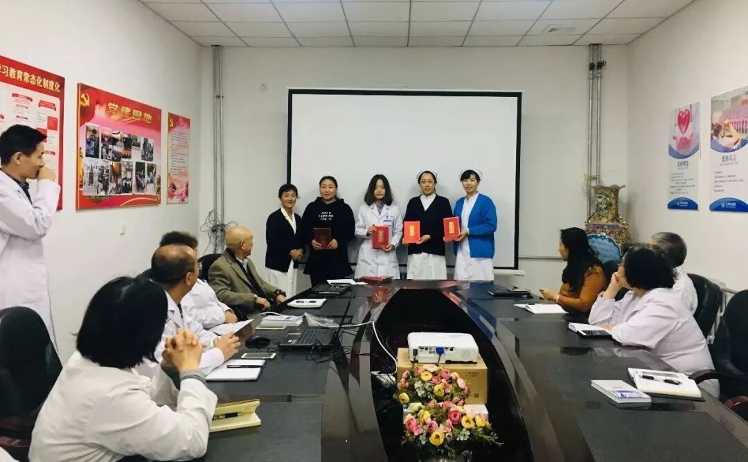 三等奖由综合办公室的郭老师,特色护理病房的闫、刘二位护士长,媒介部的赵老师,康复科的张医生代表上台领奖。