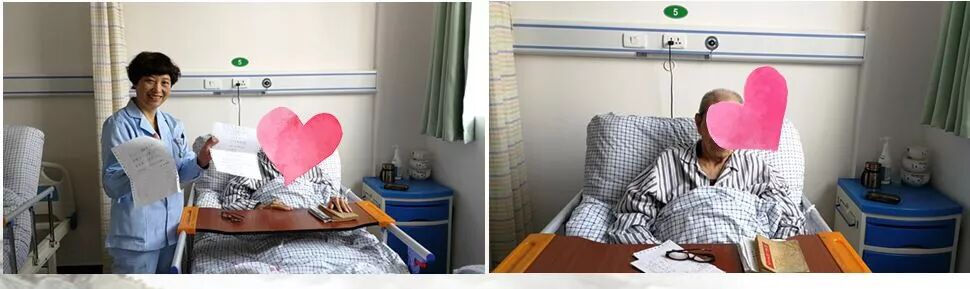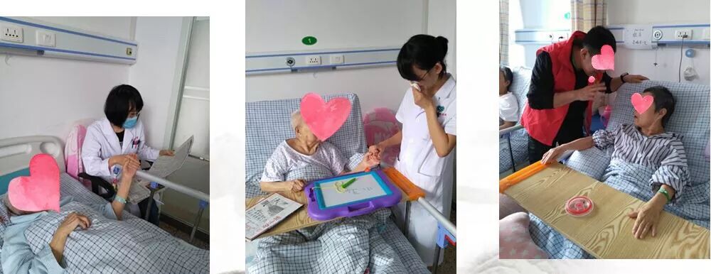 这组照片可以看出家属、医护人员在陪伴老人聊天,给老人读报纸……让老人在病房里不寂寞,而老人最需要的就是陪伴,陪伴是最好的爱,给病人有温度的照护。